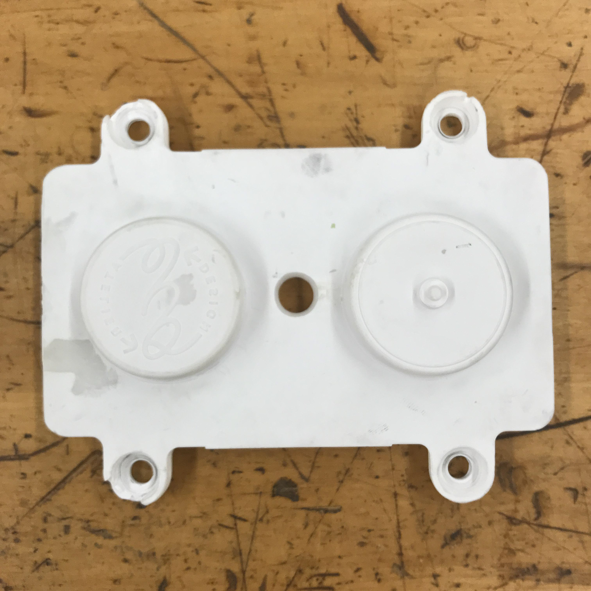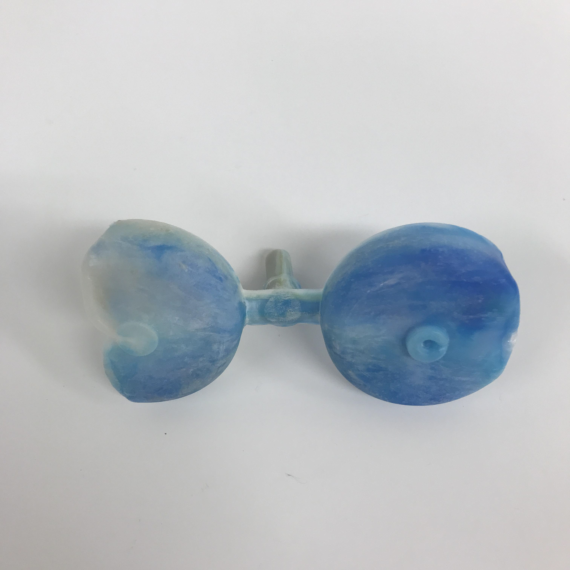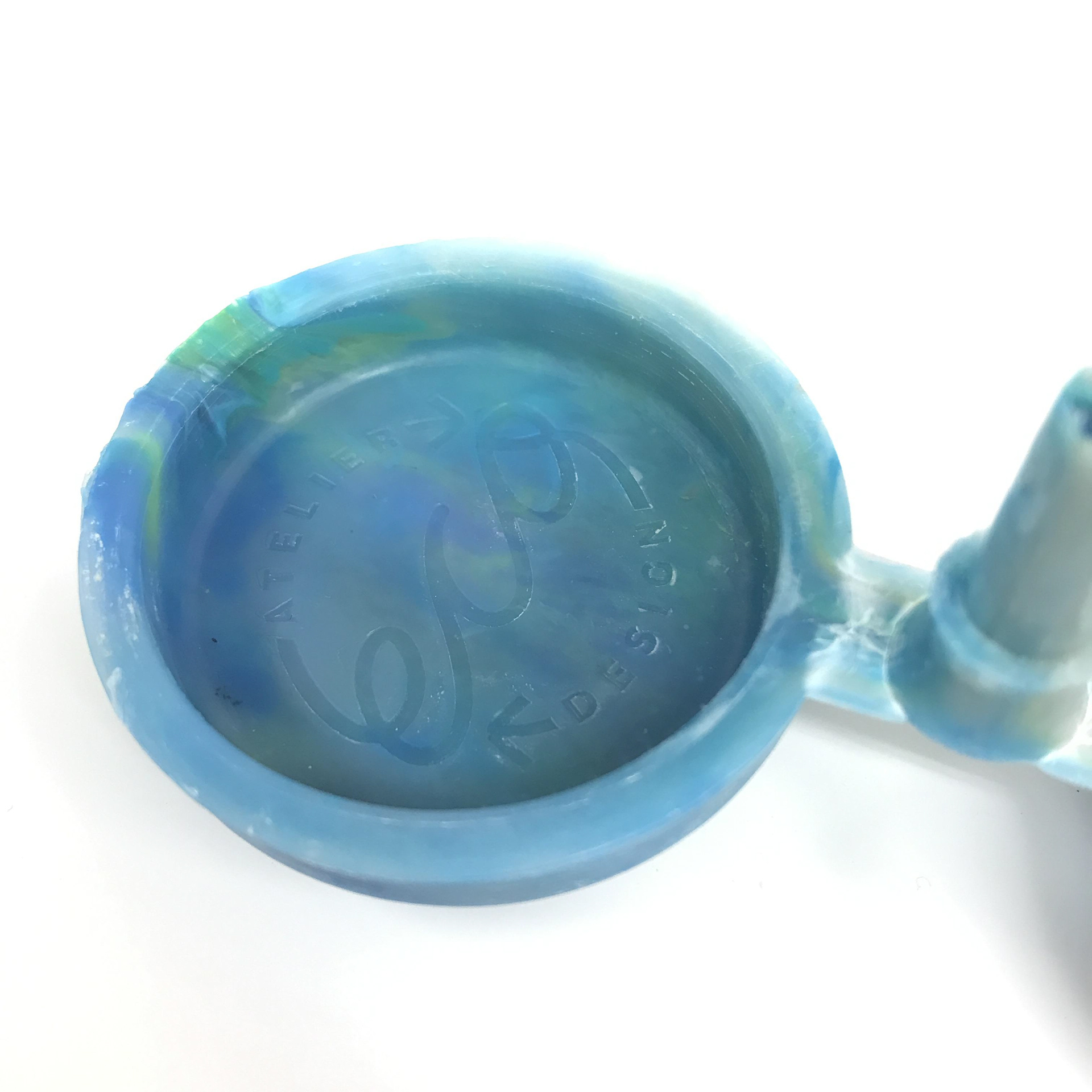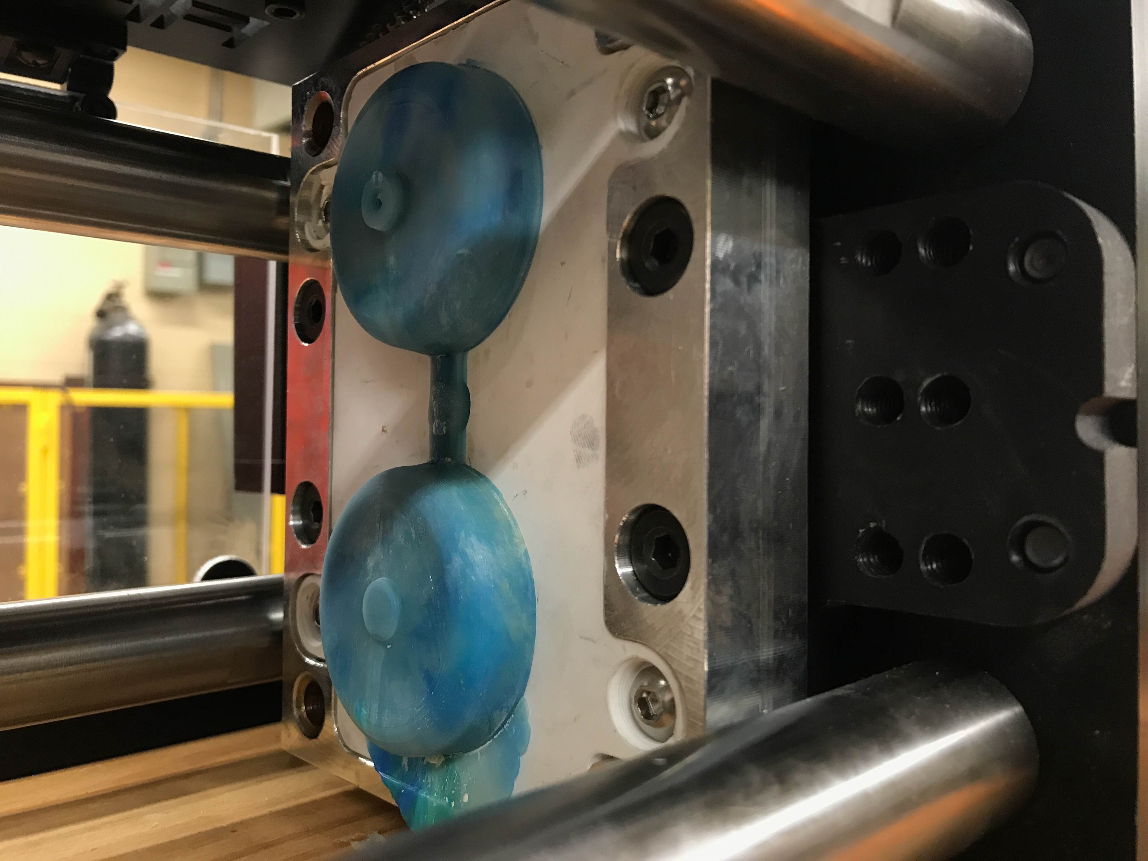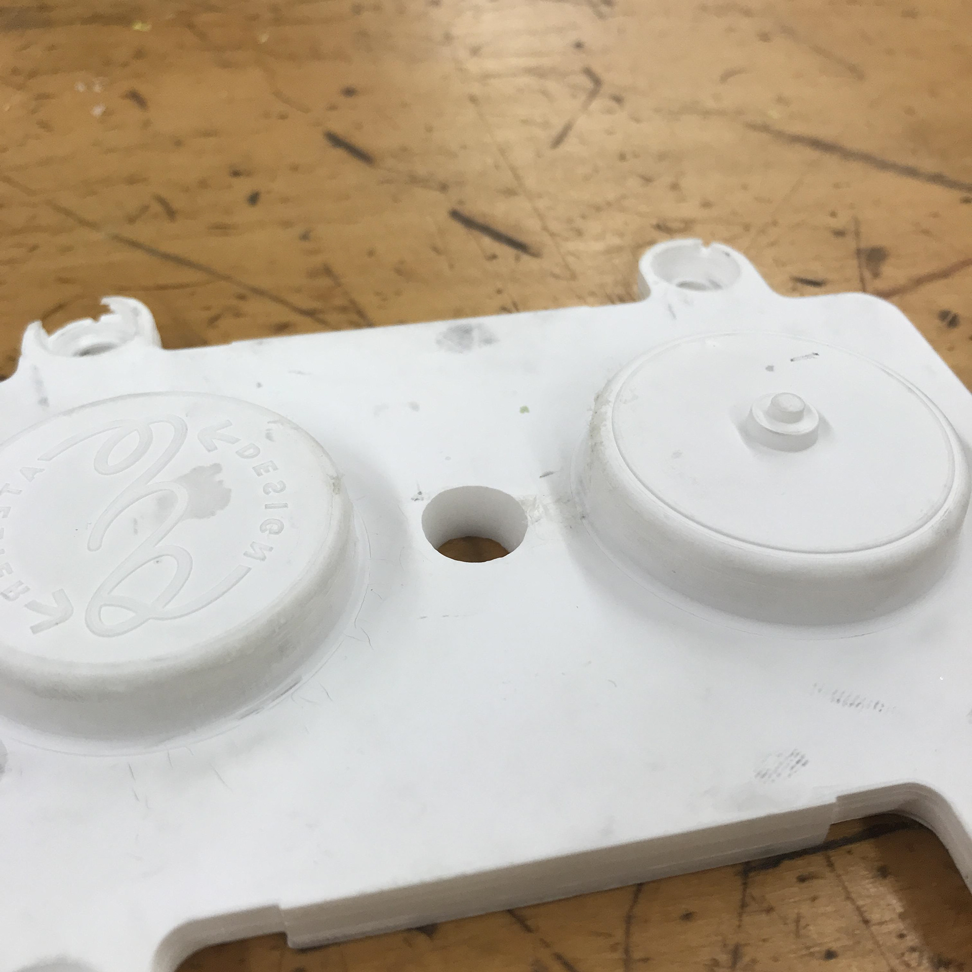 Le test numéro cinq est à ce jour notre meilleur résultat. Les deux cavités sont bien remplies, il n'y a pas de ligne de soudure et le logo est net et précis. Pour les tests subséquents, le moule a commencé à se dégrader aux endroits où nous avions bouché des trous avec du mastic à carrosserie et il s'est formé de contre dépouilles aux extrémités du moule. Nous avons donc décidé d’arrêter les tests pour le moment et de recommencer avec un nouveau moule et d'en profiter pour y implémenter toutes les modifications que nous avions dû faire manuellement.