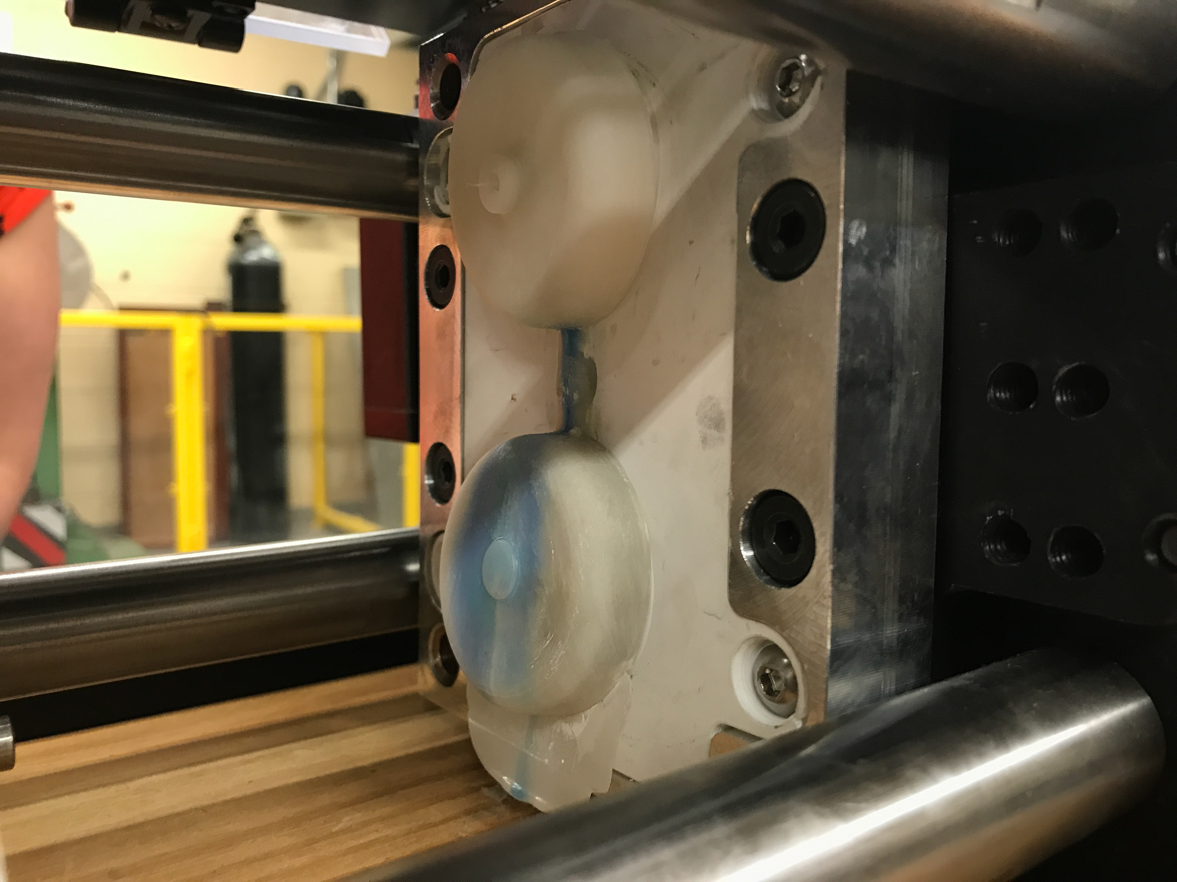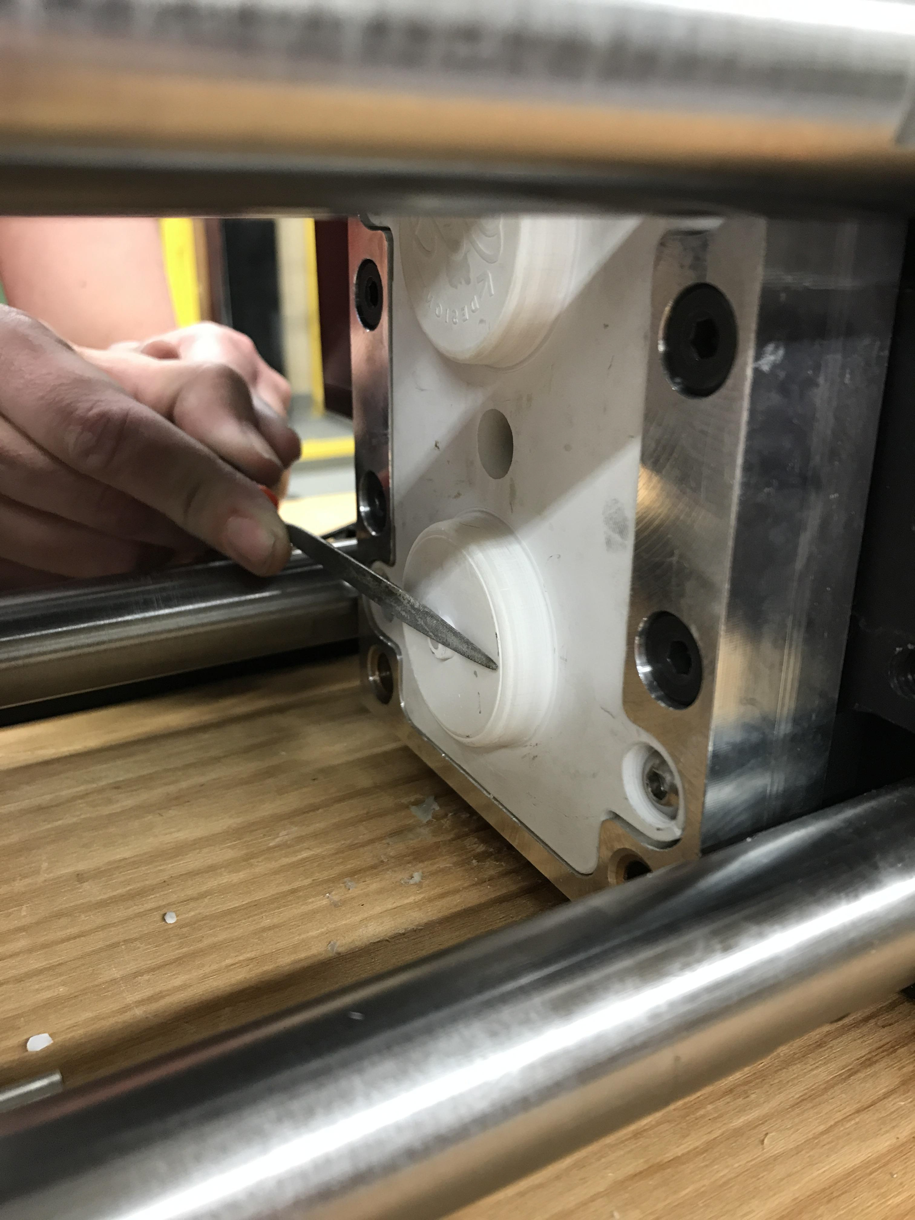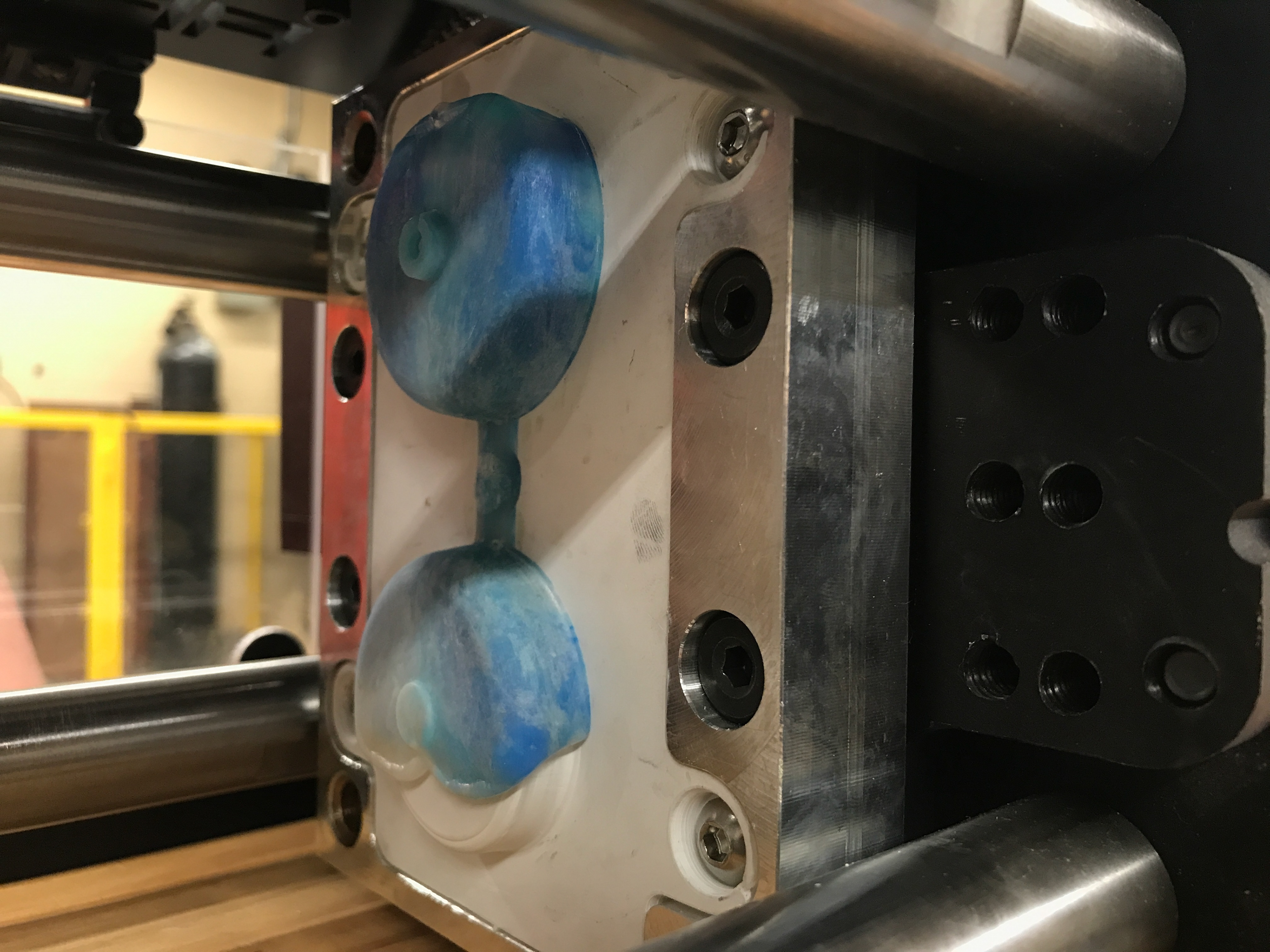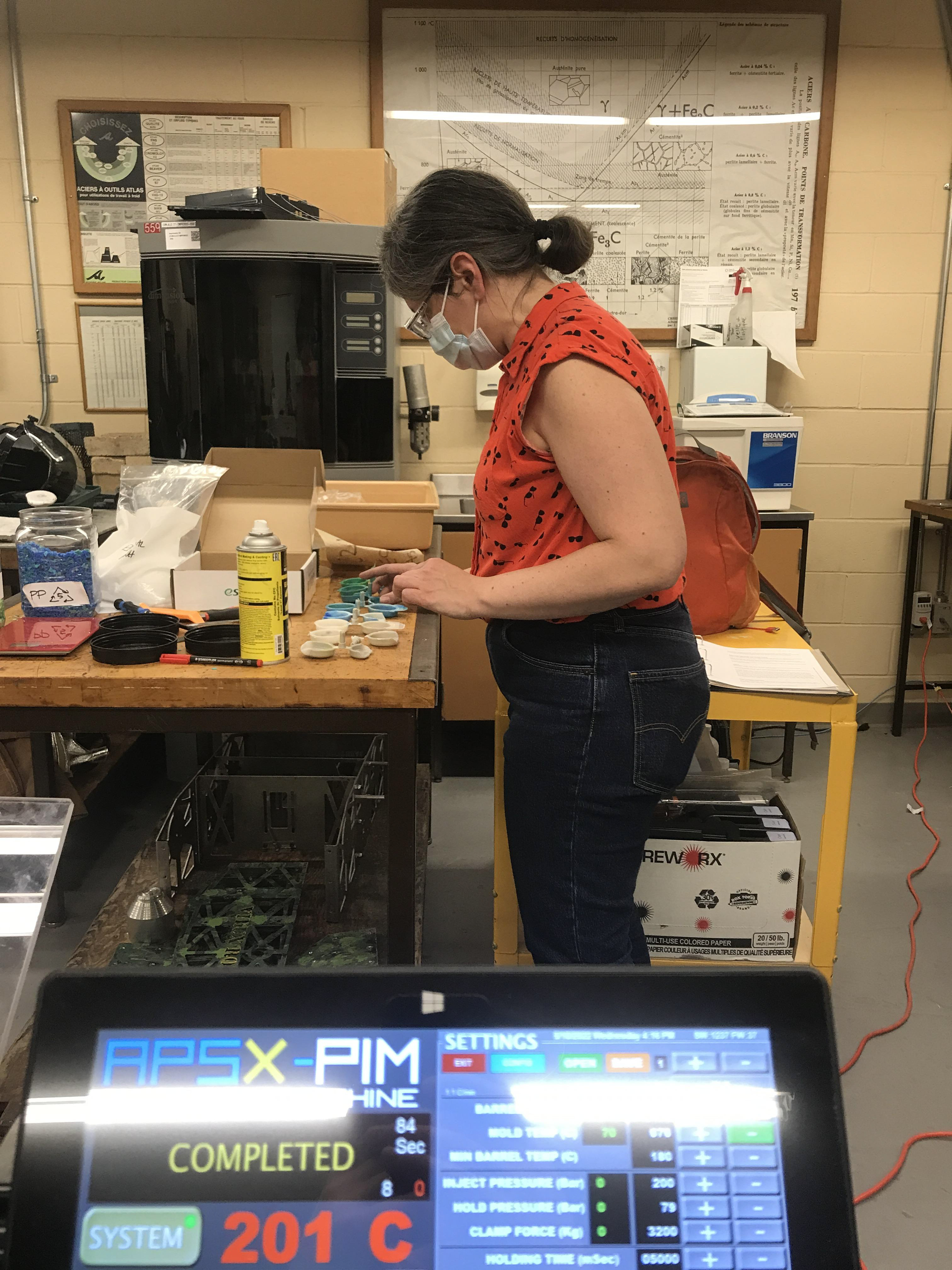En cette deuxième journée d'injection, nous avons décidé d'avoir une approche plus méthodique. J'ai commencé par apporter deux modifications aux moules qui aideront à résoudre le problème du plastique qui s'infiltre entre les deux empreintes près du seuil d'injection. Nous avons ensuite réinstallé le moule sur la machine pour débuter les tests.