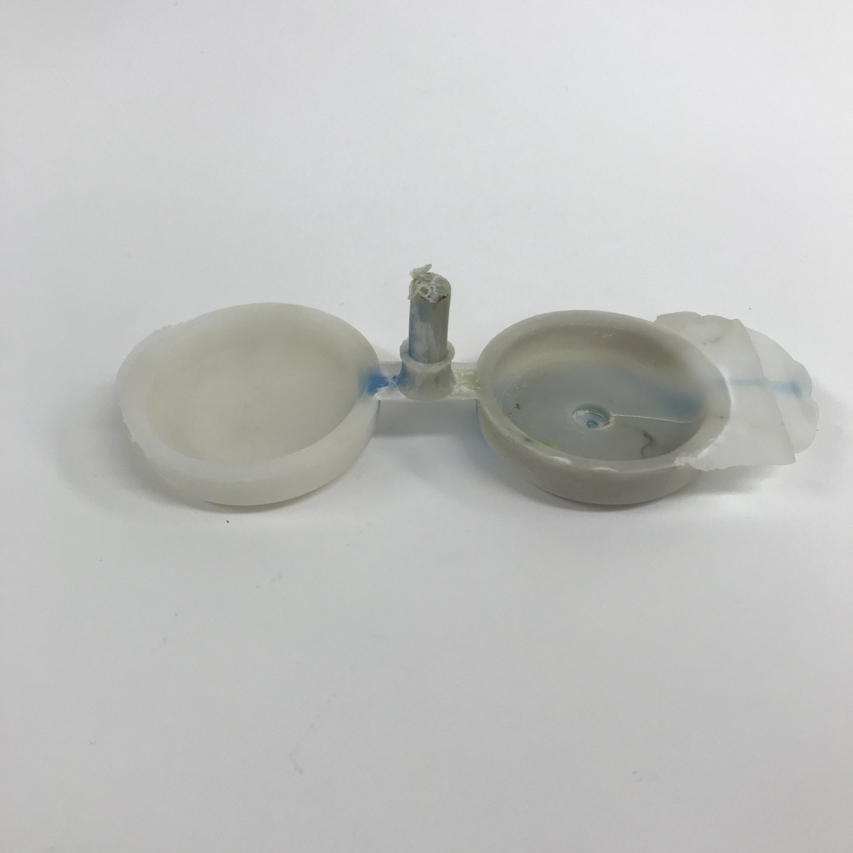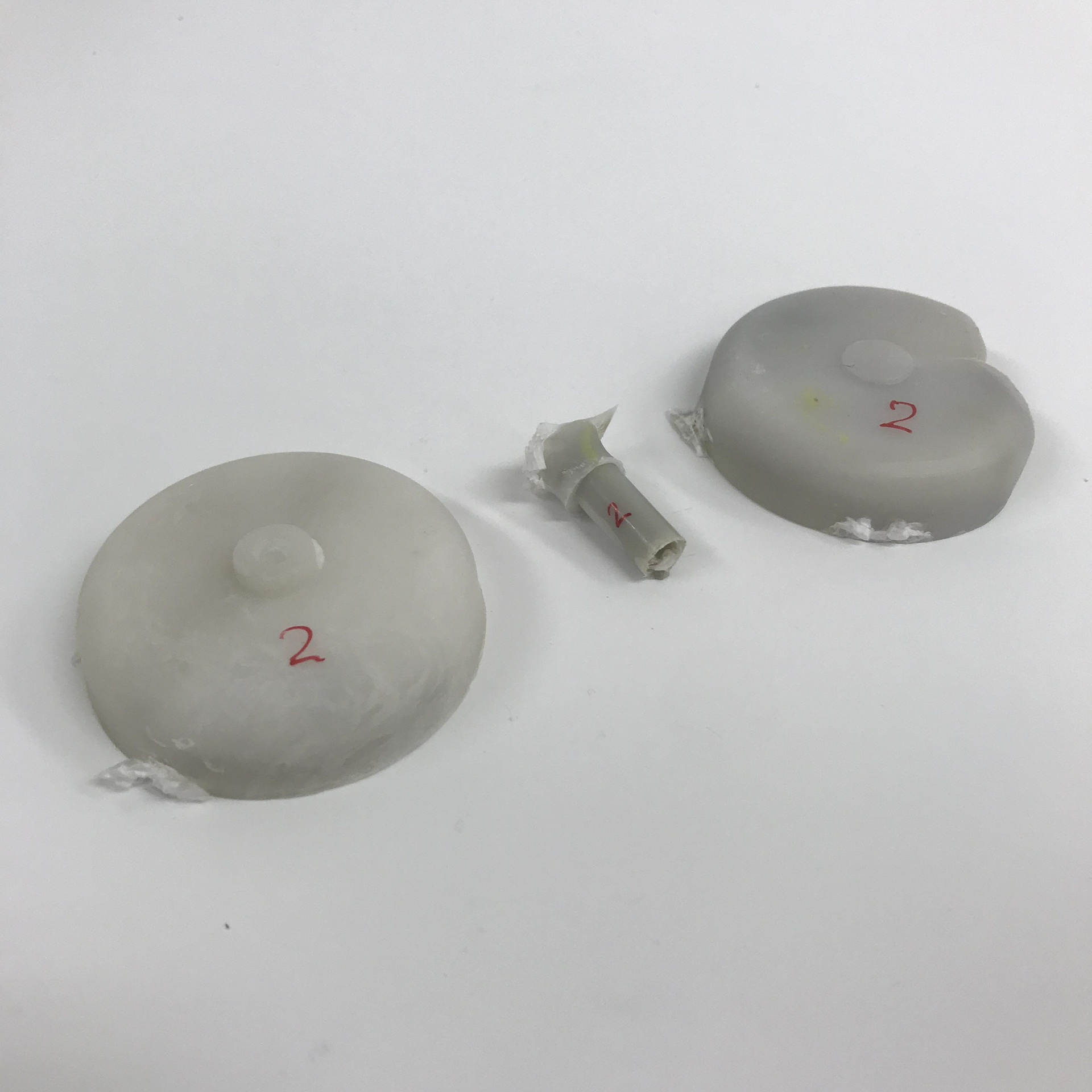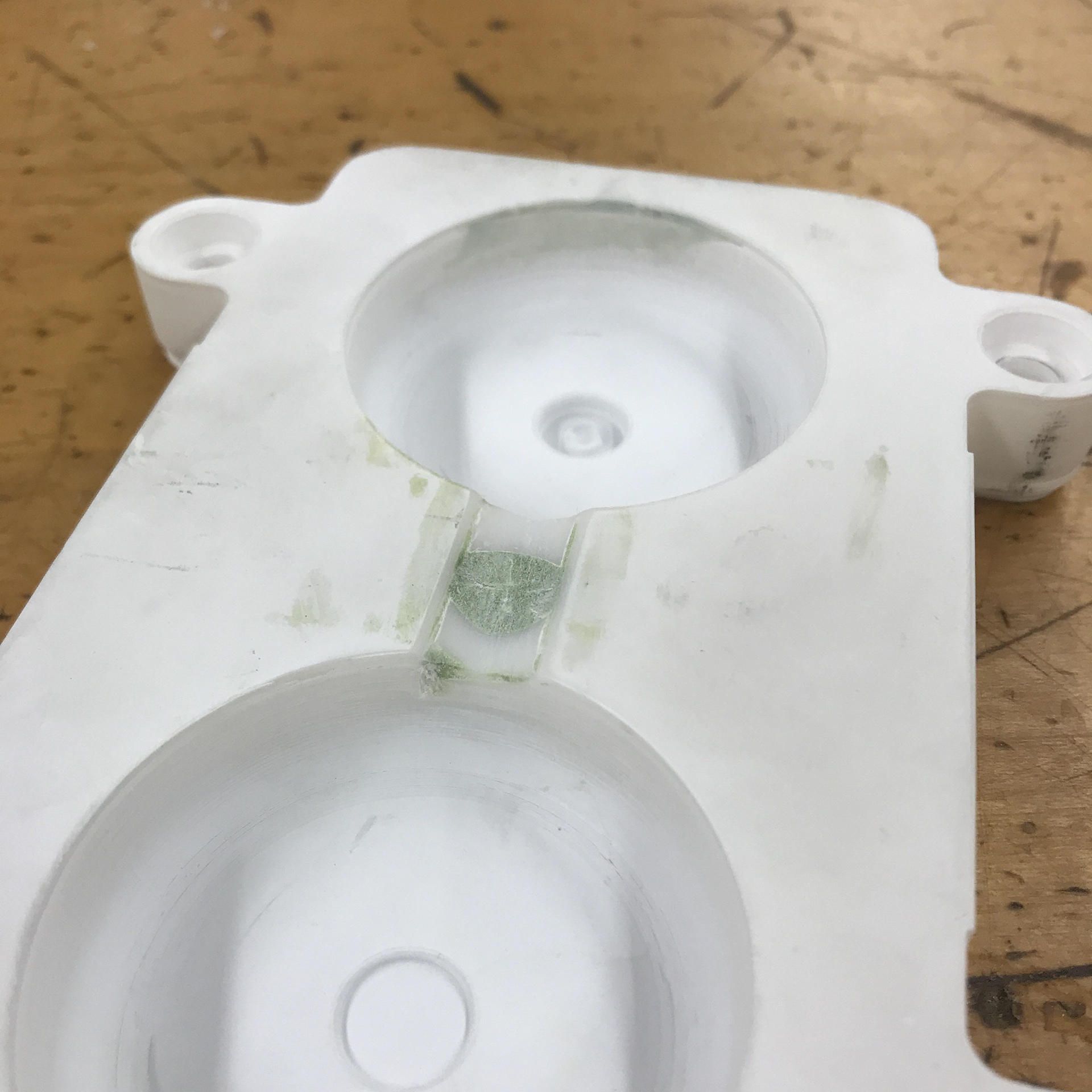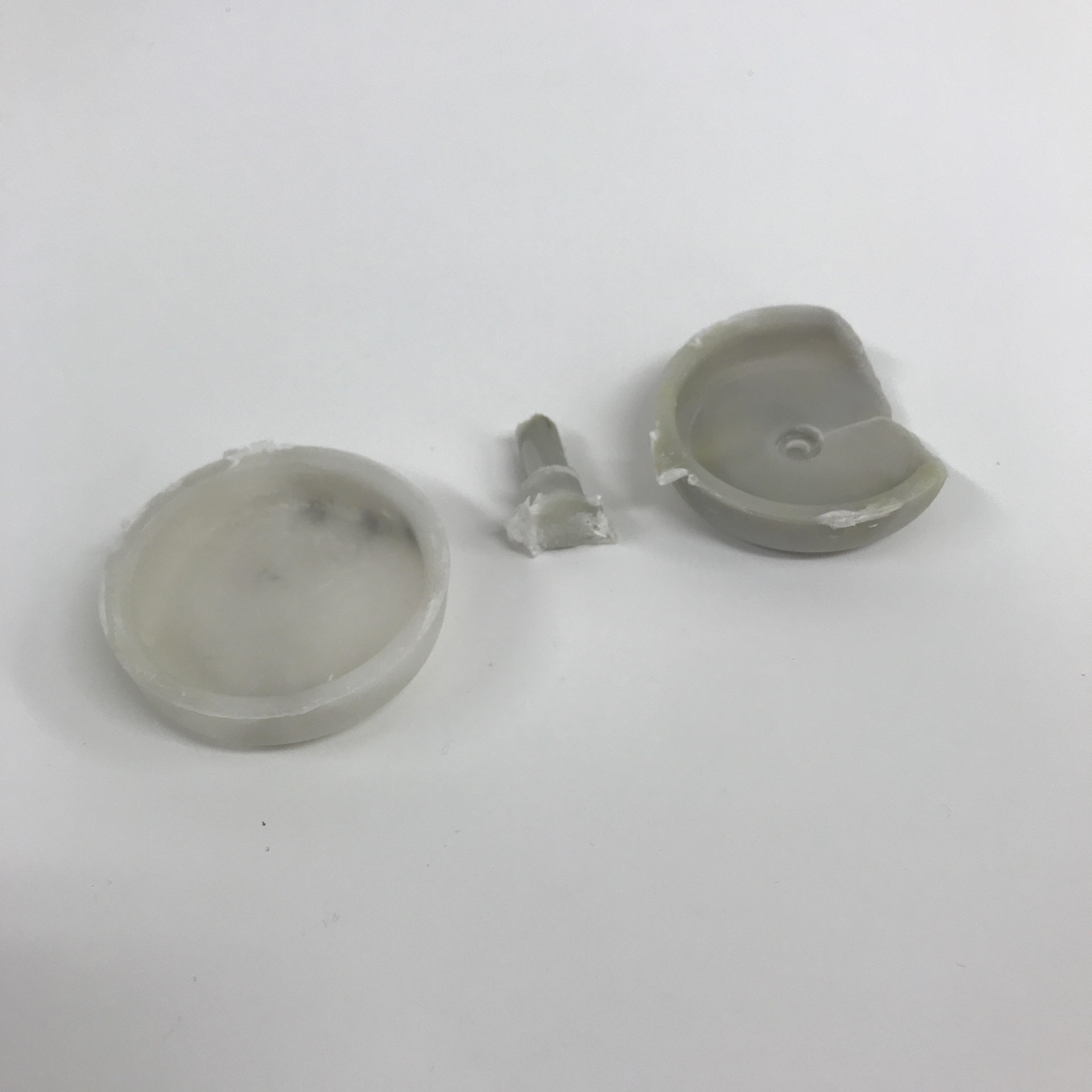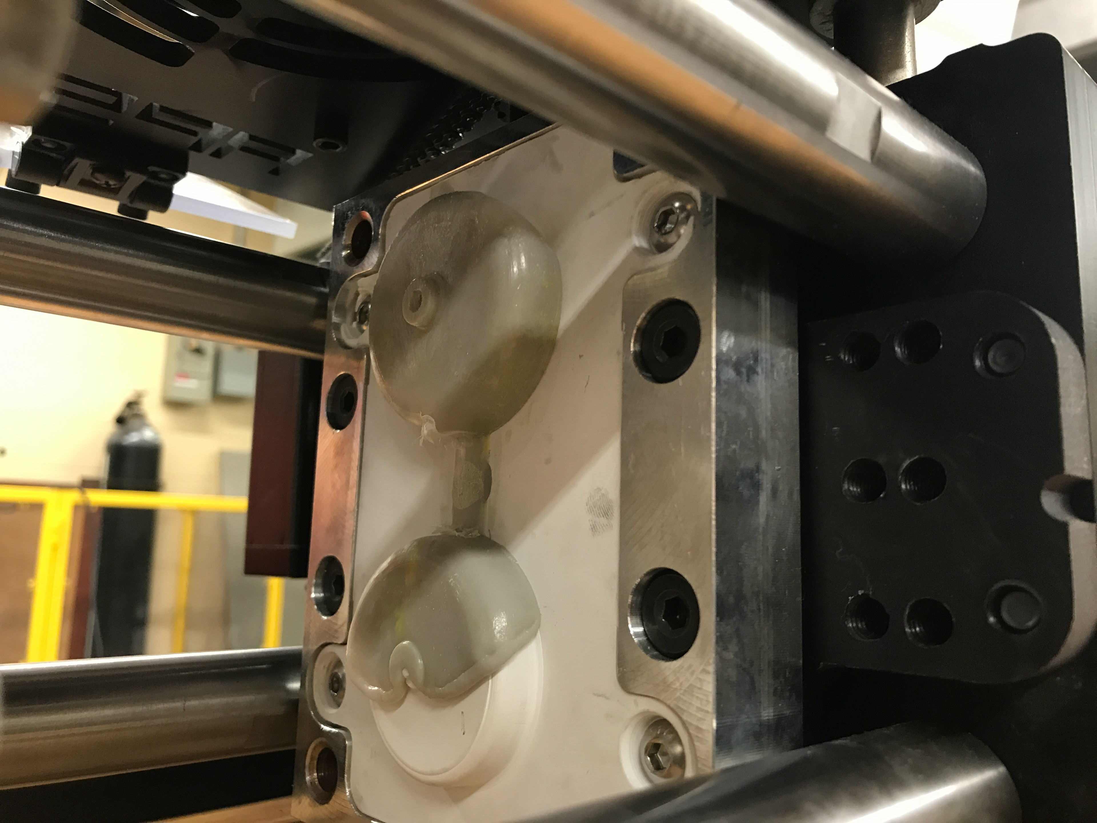 En prenant le temps d’analyser les défauts sur les pièces des tests numéro un à quatre, nous avons remarqué une ligne de soudure sur l'un des deux côtés. On peut la voir clairement sur la pièce numéro trois à droite dans la photo ci-dessous. Cette ligne ne cause pas vraiment de soucis pour l'intégrité physique de l'objet, mais c'est un défaut cosmétique que nous voulions réglé. Yolaine m'explique que cette ligne est causée par plot de vissage au centre du yo-yo qui divise le flot du plastique en deux et la ligne apparaît à l'endroit où les deux courants se rencontrent. Nous avons décidé d'altérer cette partie du moule avec une petite lime alors qu'il est encore sur la machine. Cela nous a permis d'observer immédiatement le résultat de la modification.