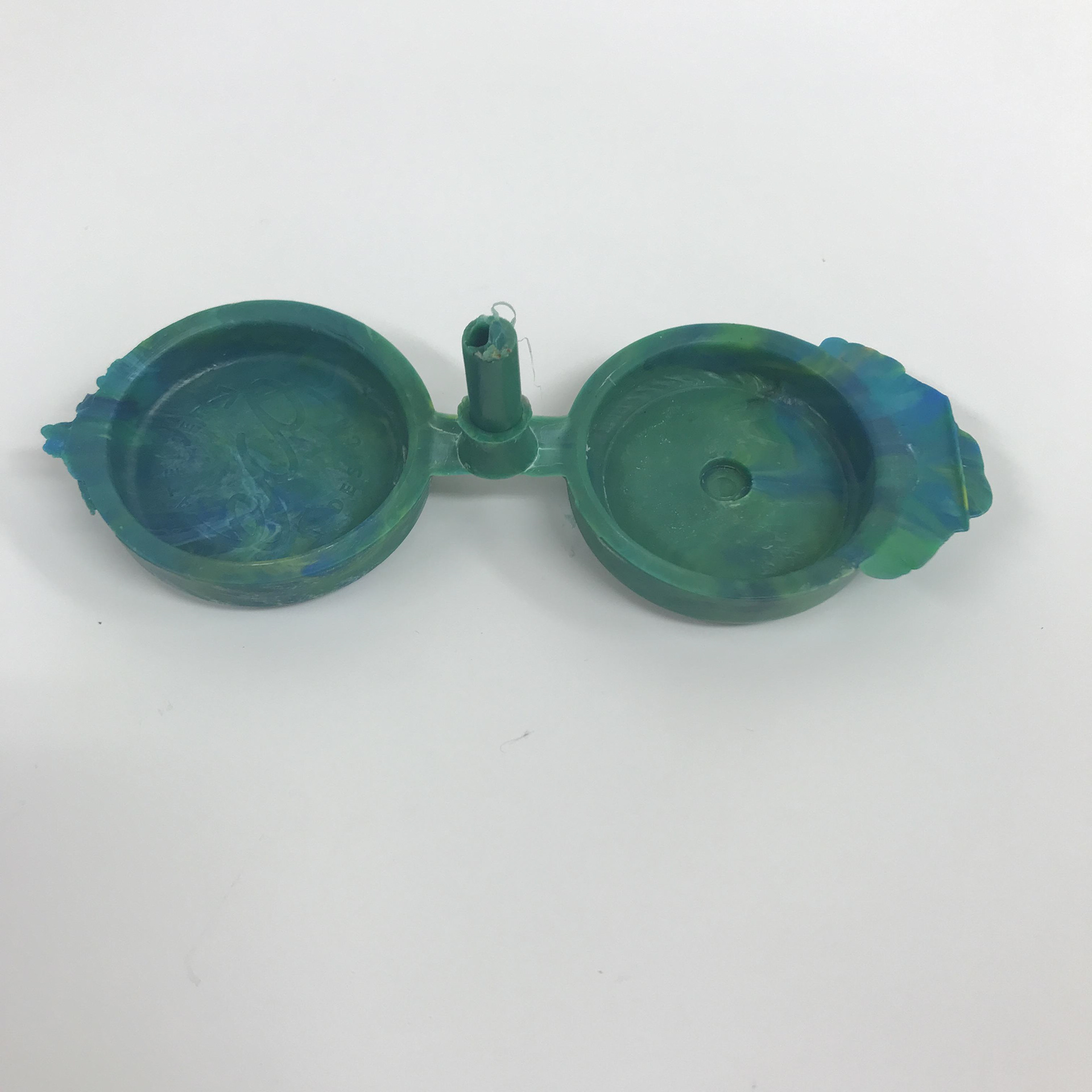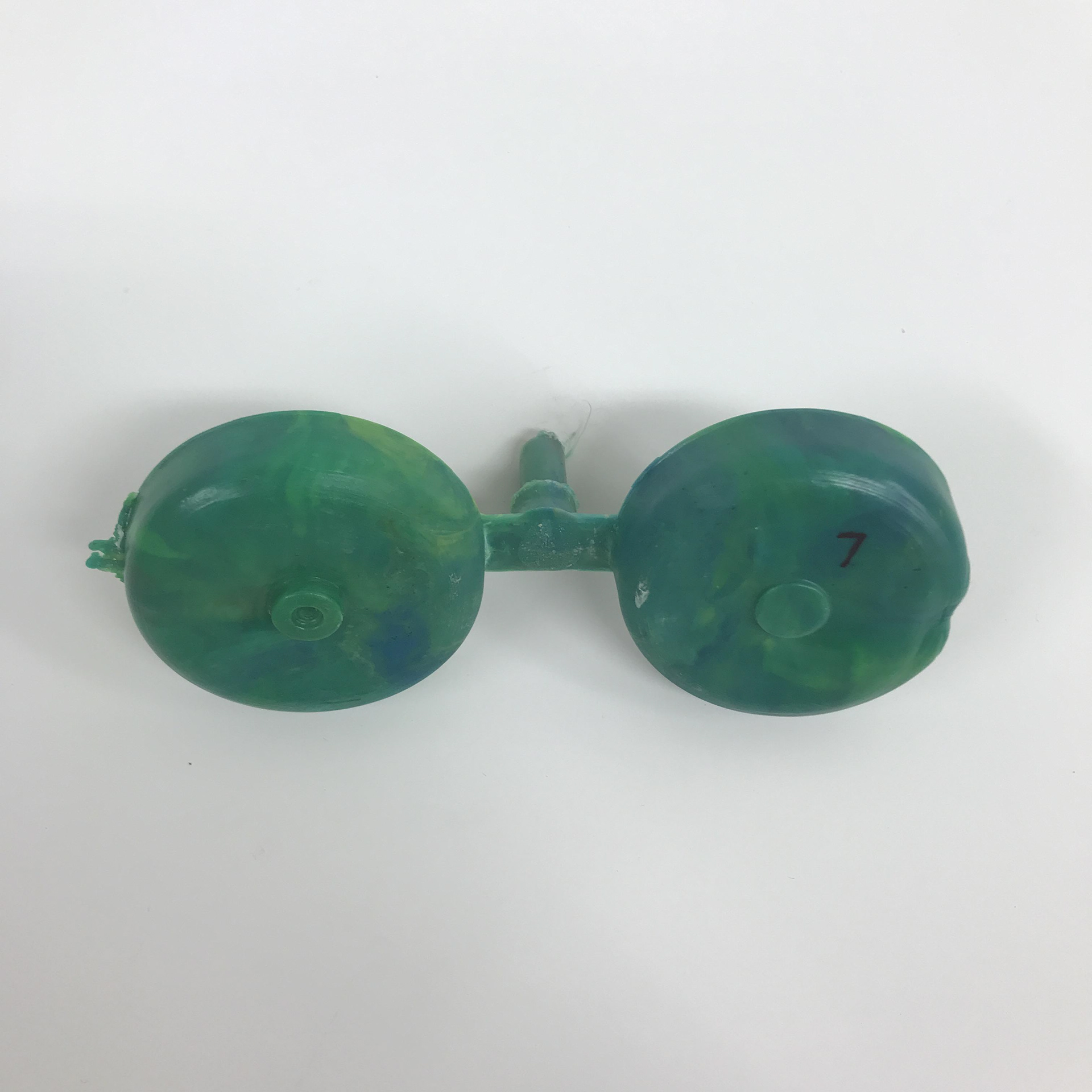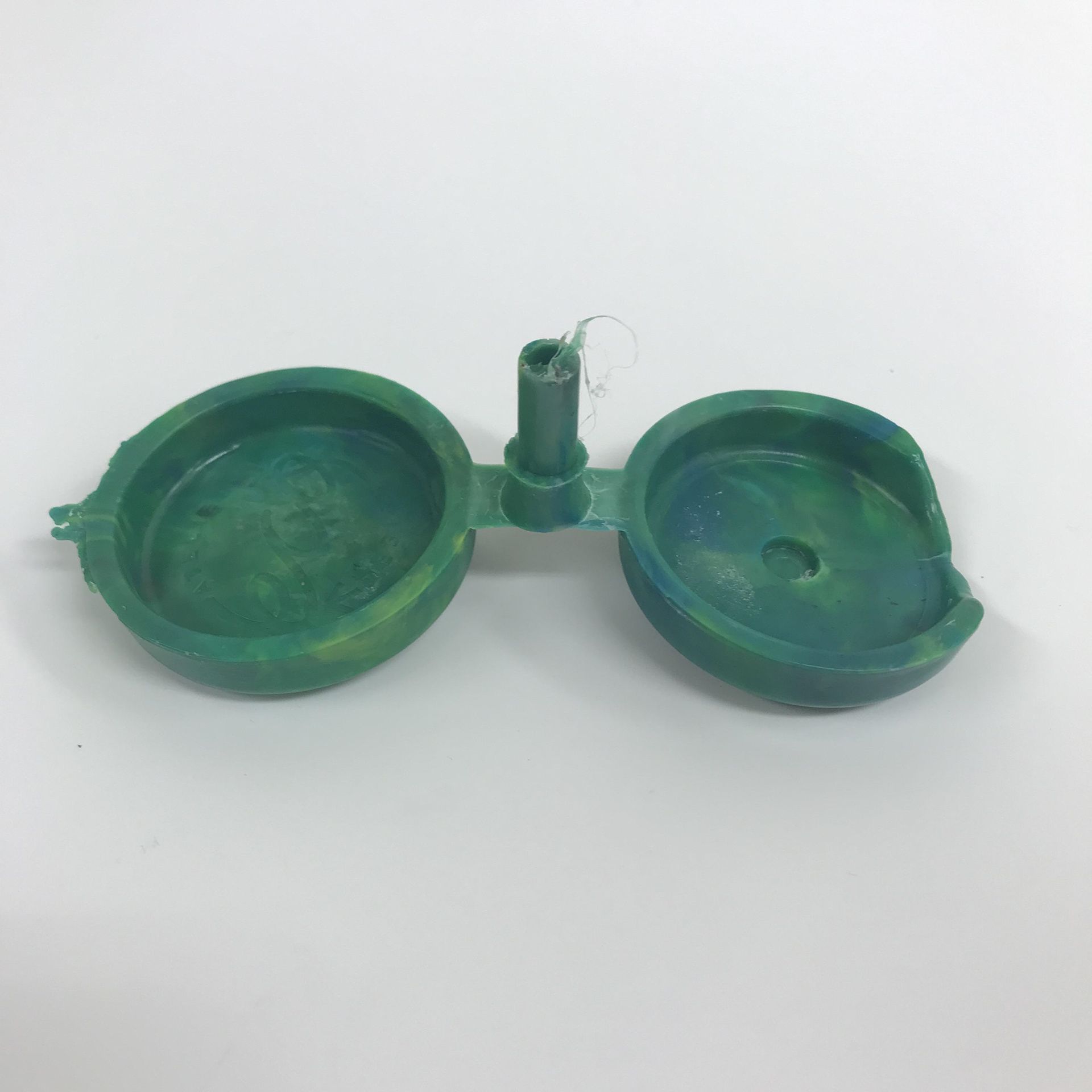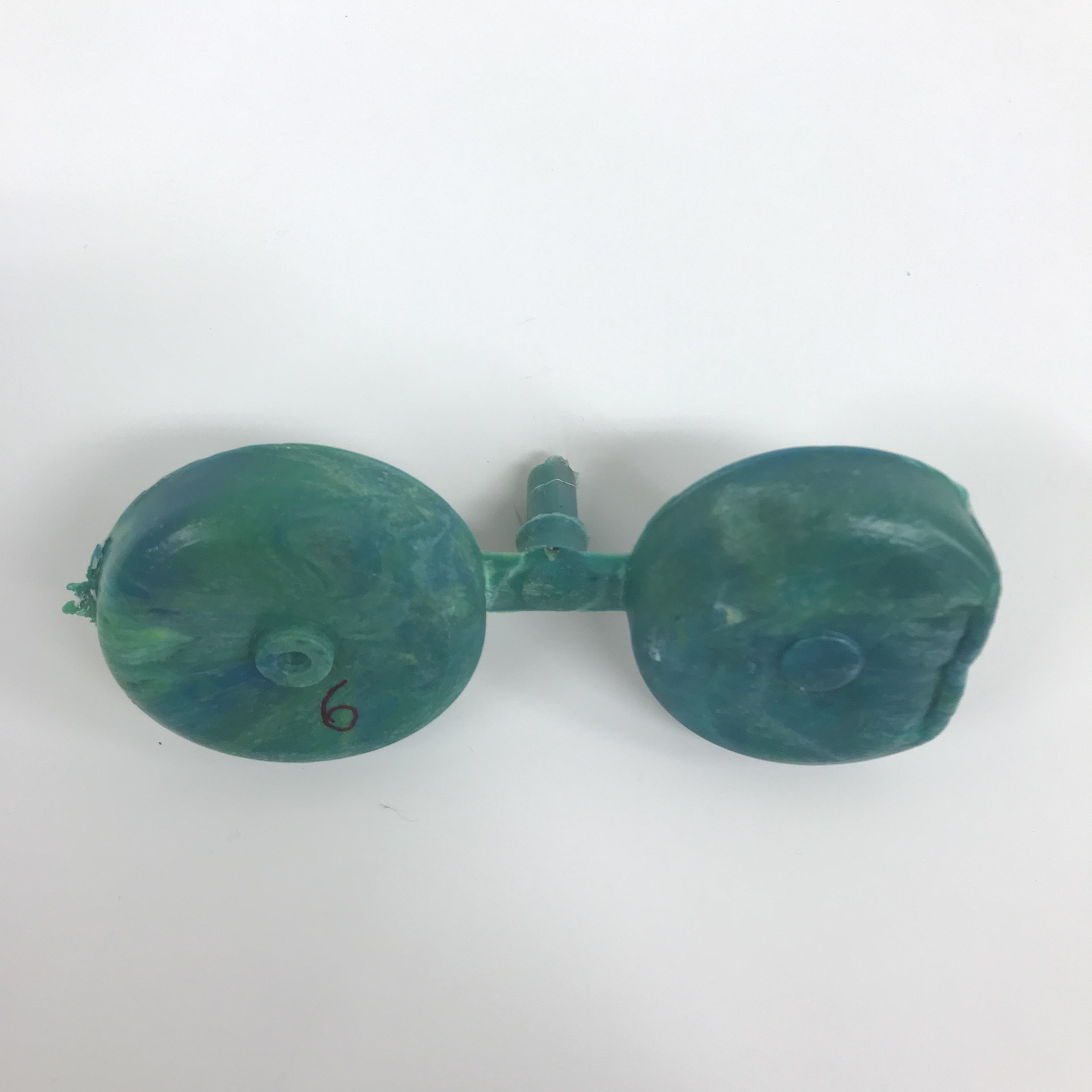 En prenant le temps d’analyser les défauts sur les pièces des tests numéro un à quatre, nous avons remarqué une ligne de soudure sur l'un des deux côtés. On peut la voir clairement sur la pièce numéro trois à droite dans la photo ci-dessous. Cette ligne ne cause pas vraiment de soucis pour l'intégrité physique de l'objet, mais c'est un défaut cosmétique que nous voulions réglé. Yolaine m'explique que cette ligne est causée par plot de vissage au centre du yo-yo qui divise le flot du plastique en deux et la ligne apparaît à l'endroit où les deux courants se rencontrent. Nous avons décidé d'altérer cette partie du moule avec une petite lime alors qu'il est encore sur la machine. Cela nous a permis d'observer immédiatement le résultat de la modification.