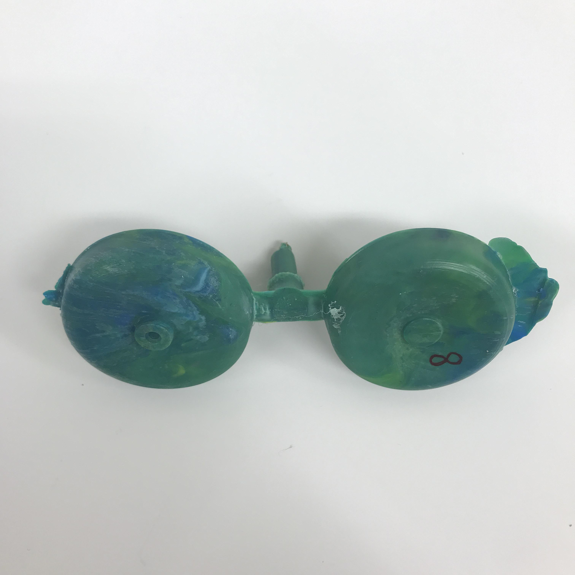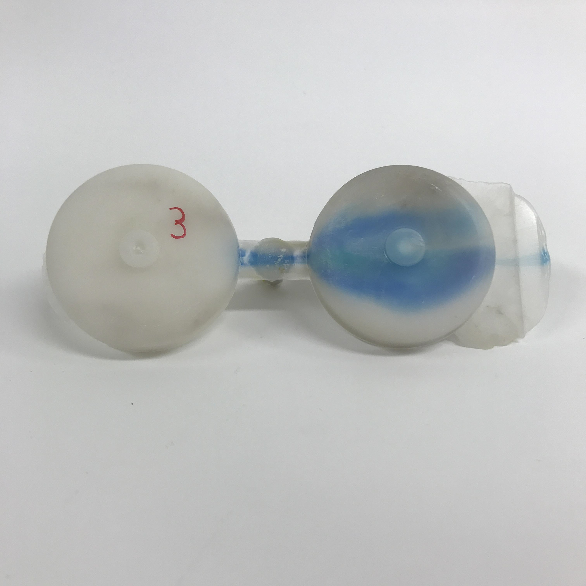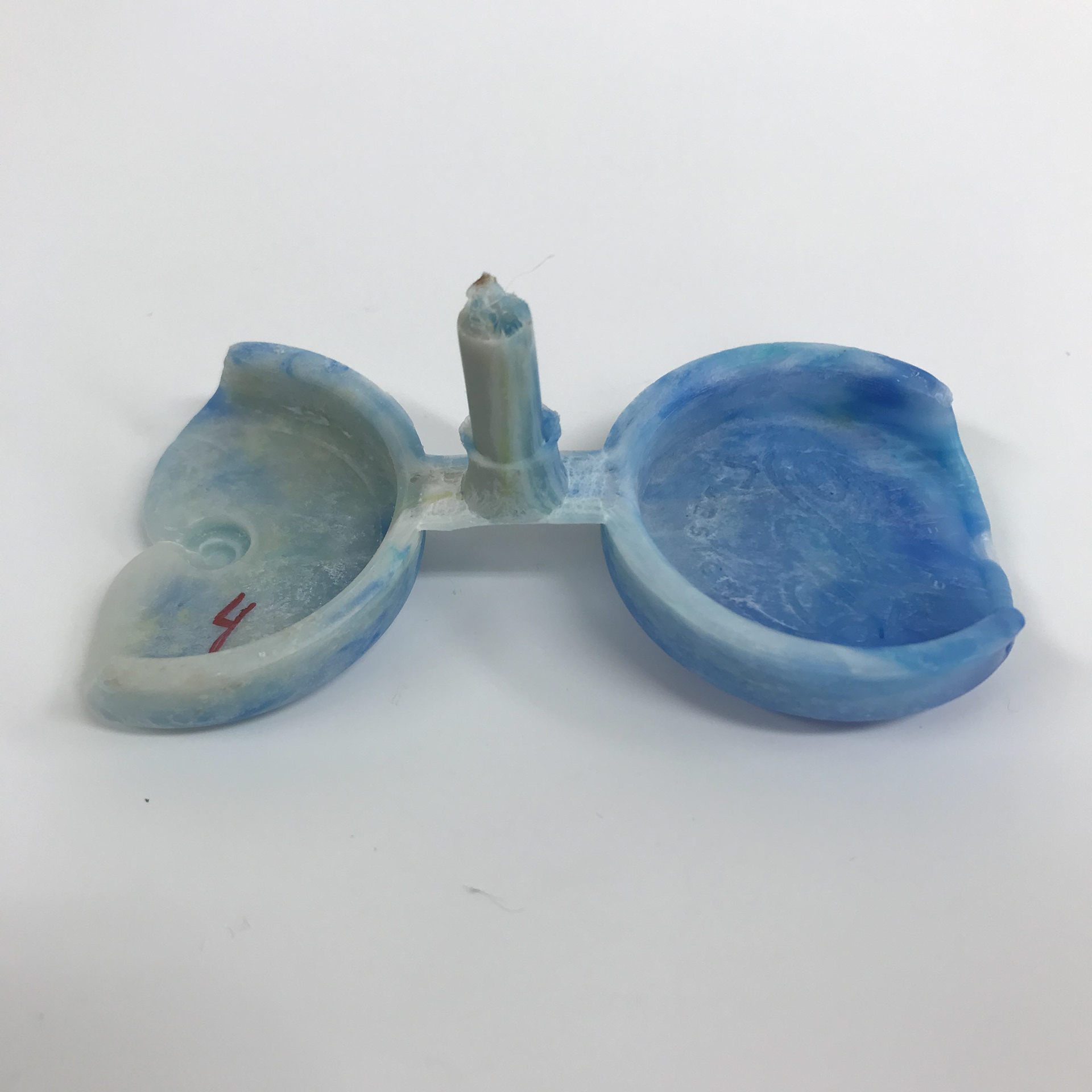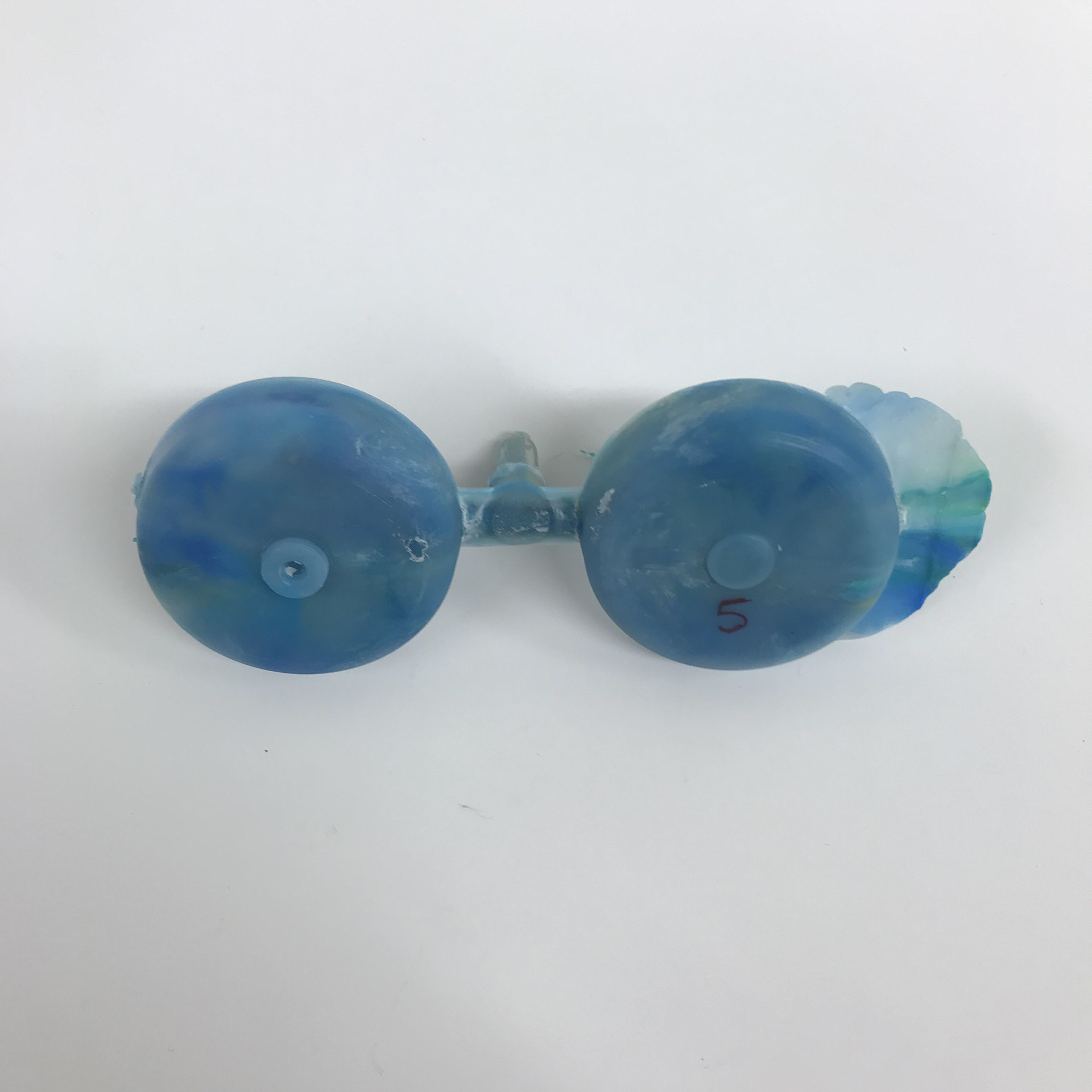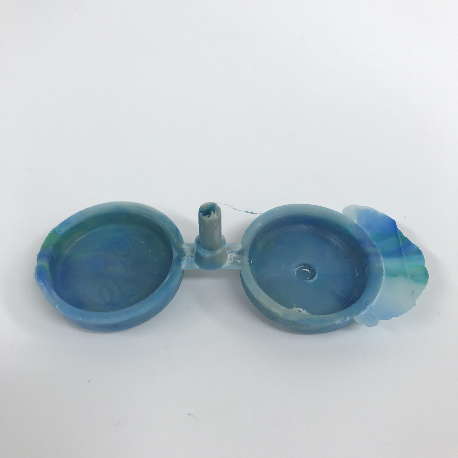 En prenant le temps d’analyser les défauts sur les pièces des tests numéro un à quatre, nous avons remarqué une ligne de soudure sur l'un des deux côtés. On peut la voir clairement sur la pièce numéro trois à droite dans la photo ci-dessous. Cette ligne ne cause pas vraiment de soucis pour l'intégrité physique de l'objet, mais c'est un défaut cosmétique que nous voulions réglé. Yolaine m'explique que cette ligne est causée par plot de vissage au centre du yo-yo qui divise le flot du plastique en deux et la ligne apparaît à l'endroit où les deux courants se rencontrent. Nous avons décidé d'altérer cette partie du moule avec une petite lime alors qu'il est encore sur la machine. Cela nous a permis d'observer immédiatement le résultat de la modification.