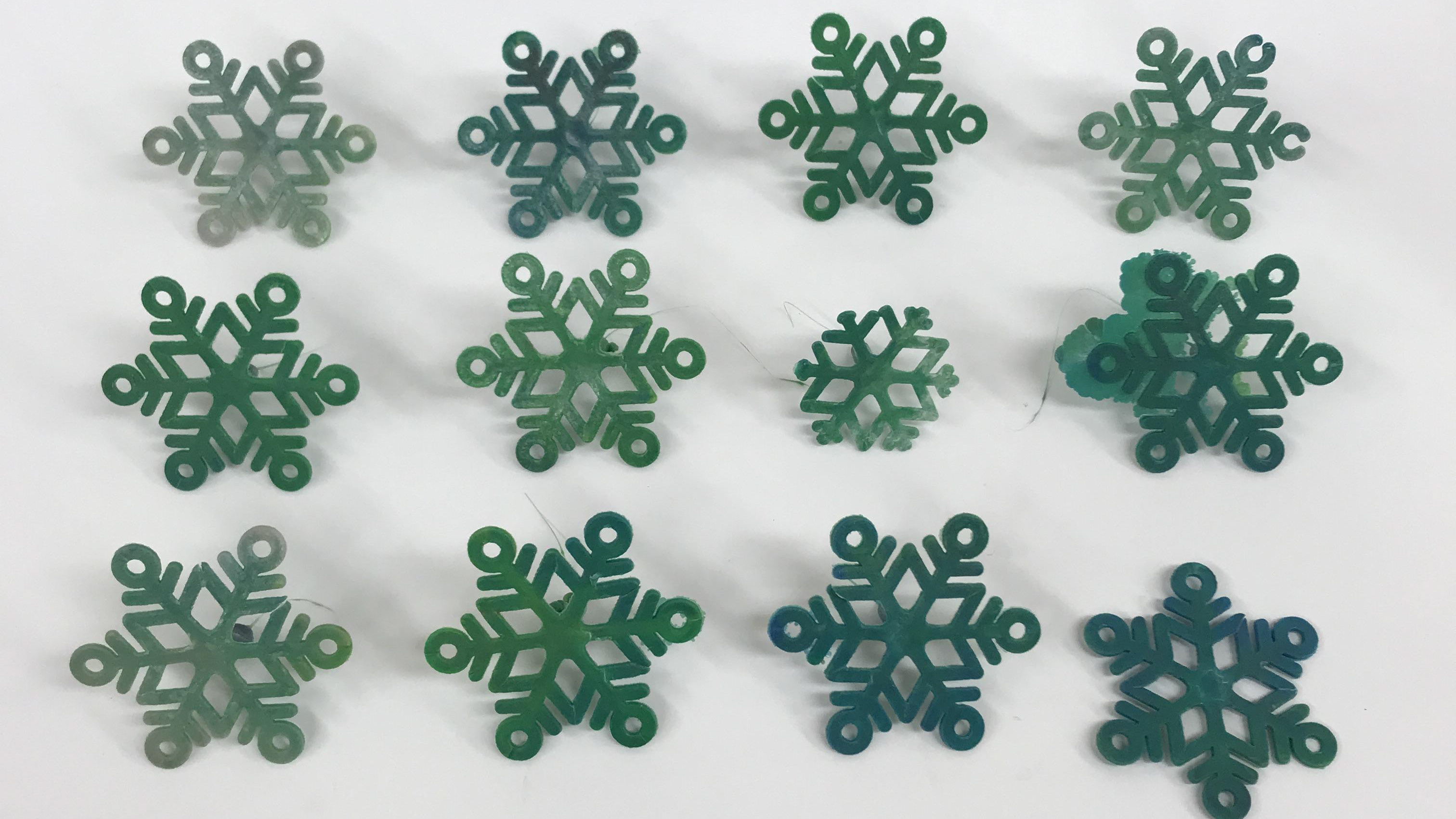 Pour le premier test, on a utilisé les paramètres qui avaient été utilisés la veille. On peut constater que les modifications apportées au seuil d'injection ont résolu le problème de pièces siamoises. Cependant, on voit aussi un peu d'étirement de la matière près du seuil d'injection et la cavité ne s'est pas complètement remplie. Pour le test numéro deux, nous avons donc allongé le temps de refroidissement et augmenté la pression d'injection et nous avons tout de suite constaté une amélioration de la surface des pièces et du remplissage.