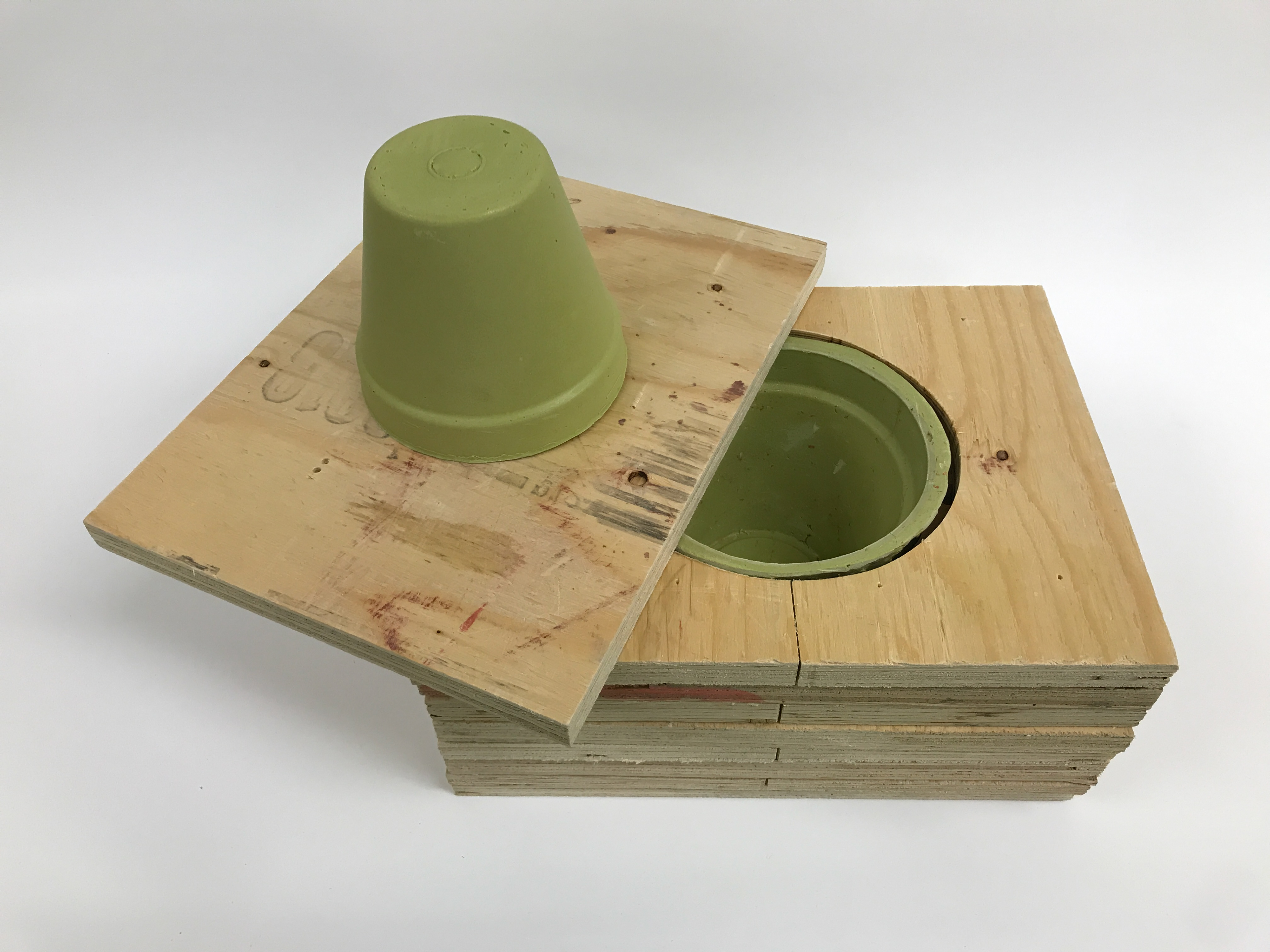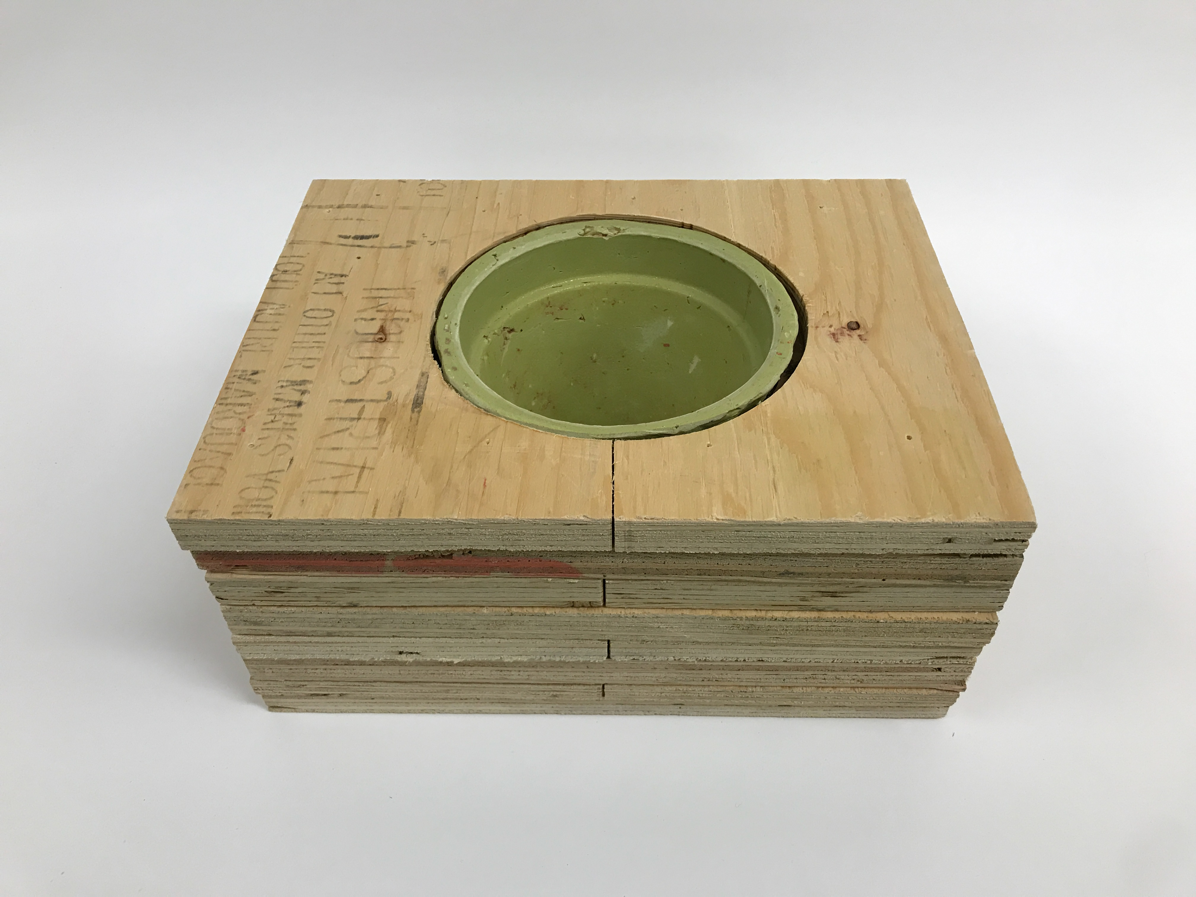 Aujourd'hui j'ai préparé un coffrage en contreplaqué pour supporter les parois du moule. J'ajouterai de plot d'alignement aux quatre coins du coffrage, mais je n'ai pas encore déterminé la forme qu'ils auront. Ces plots auront la double fonction d'assurer un espacement qui laissera s'échapper le surplus de plastique au rebord du pot. Un gros travail d'assemblage à la fibre de verre est encore requis pour joindre tous les morceaux. J'en profiterai pour réparer les petits défauts dans la cavité du moule avec le mastic.
