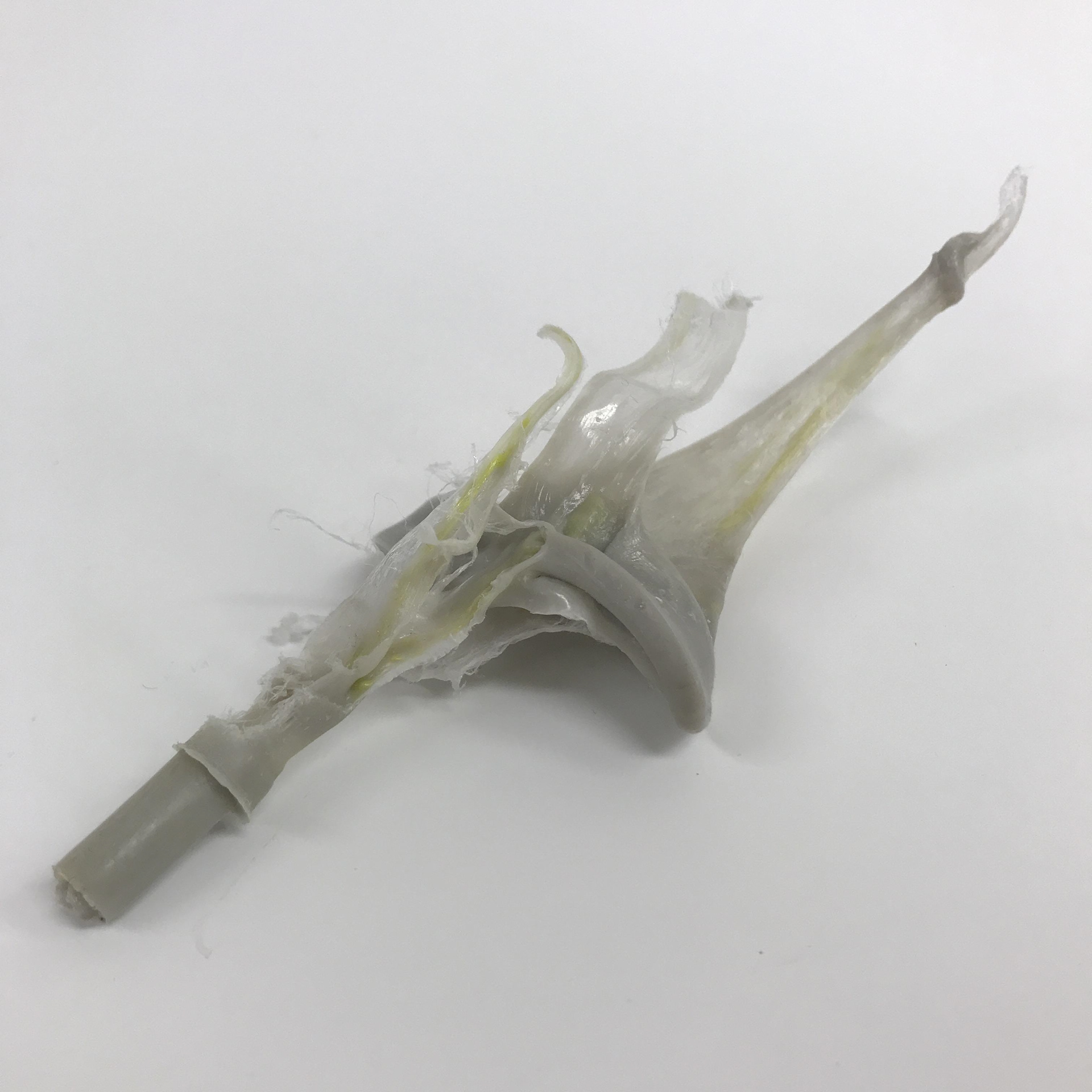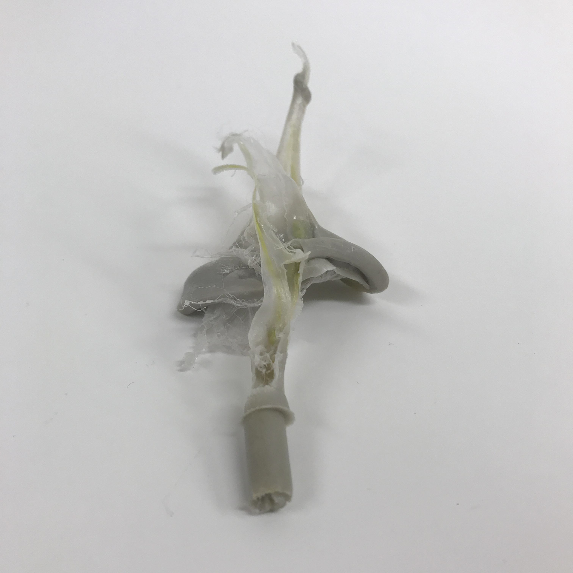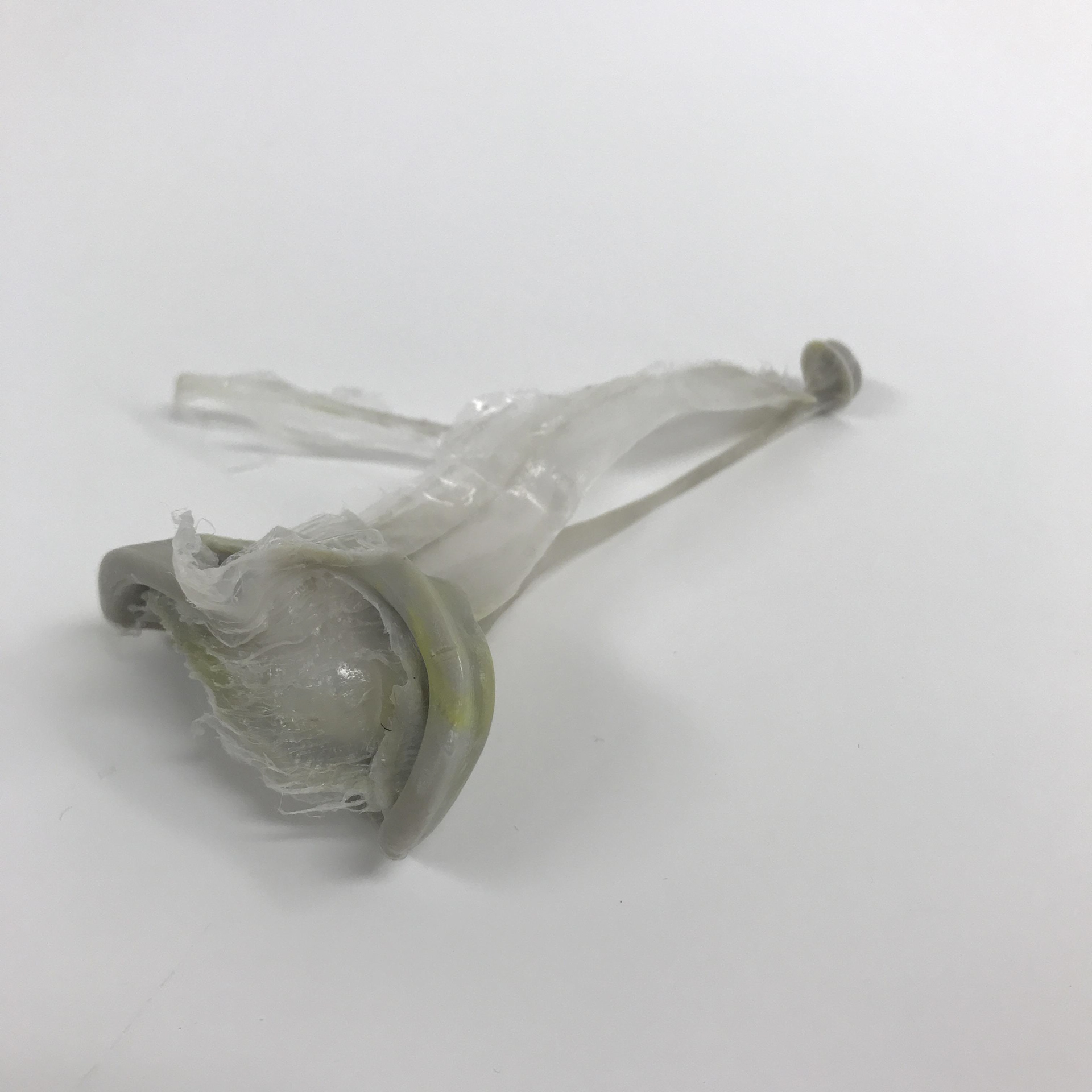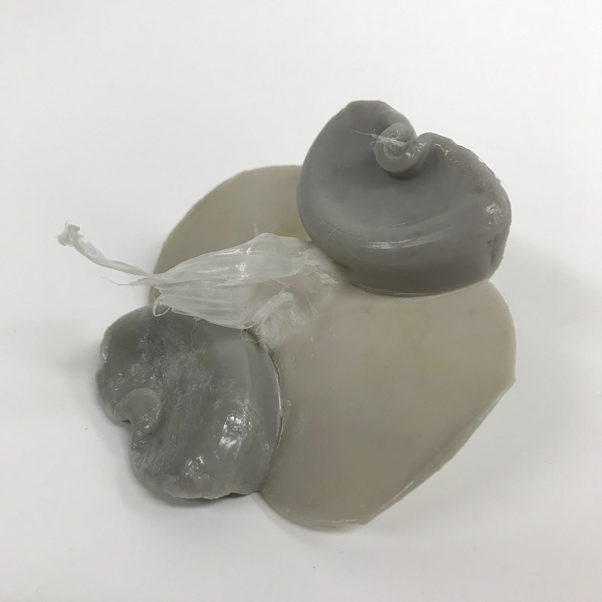 Nous changeons donc pour du HDPE gris qui lui se comporte un peu comme du caramel lorsqu'il est chaud. Tout de suite après on commence à avoir un peu plus de succès et notre meilleur résultat de la journée est un yo-yo à moitié injecté. Yolaine et moi sommes tout de même heureux, car nous avons pu identifier plusieurs choses à modifier pour notre prochain essai. Premièrement nous avons décidé d'agrandir le seuil d'injection pour minimiser le débordement qui a lieu entre les deux empreintes. Nous allons augmenter l'angle de démoulage de la carotte d'injection et allonger le cycle de refroidissement pour empêcher la pièce de se déformer à l'ouverture du moule. Et pour ce qui est de la cavité à moitié remplie, nous avons réalisé que nous avions oublié de réajuster la pression d'injection après avoir purgé la machine. Nous finissons la journée convaincue que la prochaine fois sera la bonne et nous choisissons de voir le yo-yo à moitié plein.