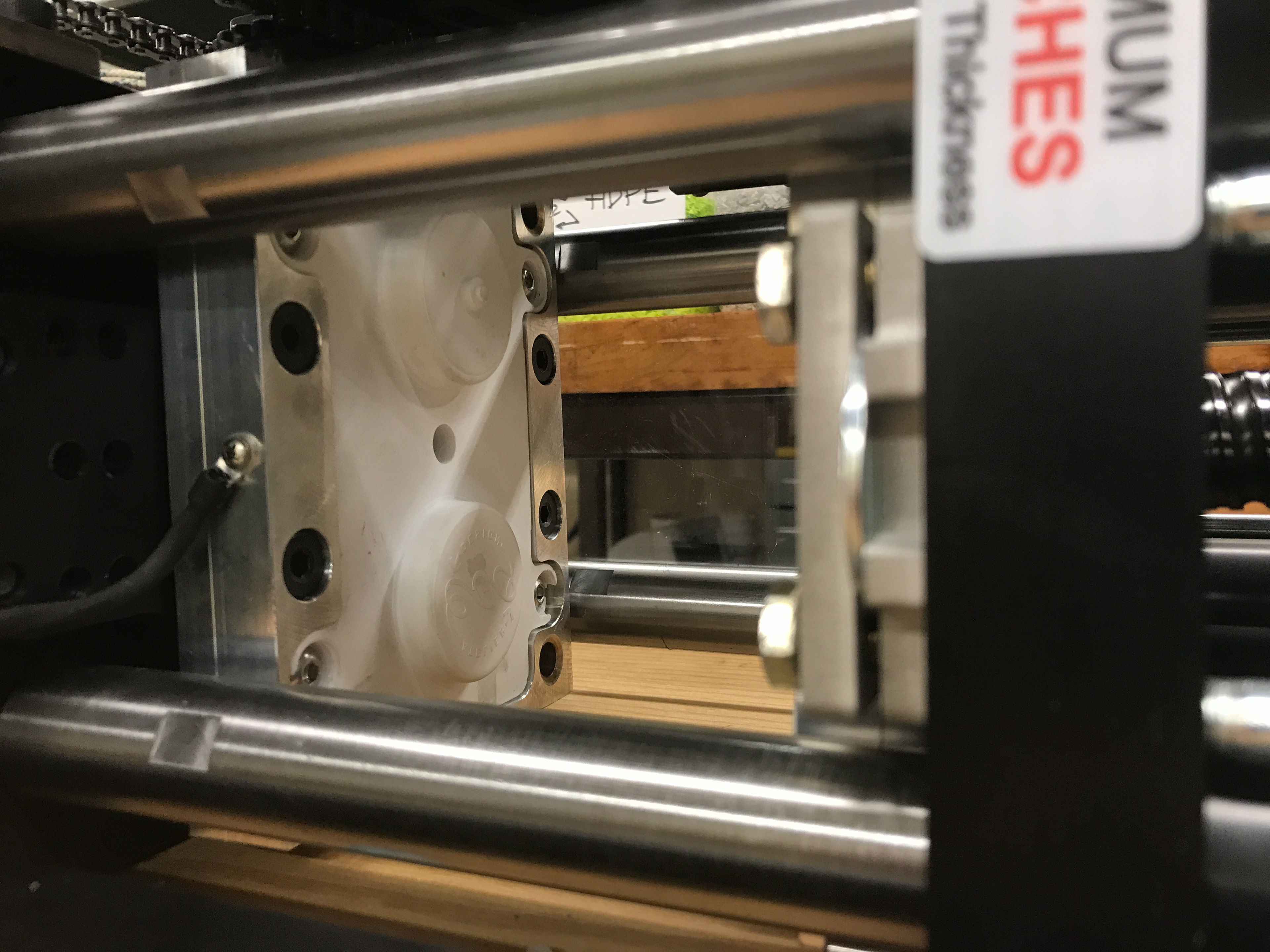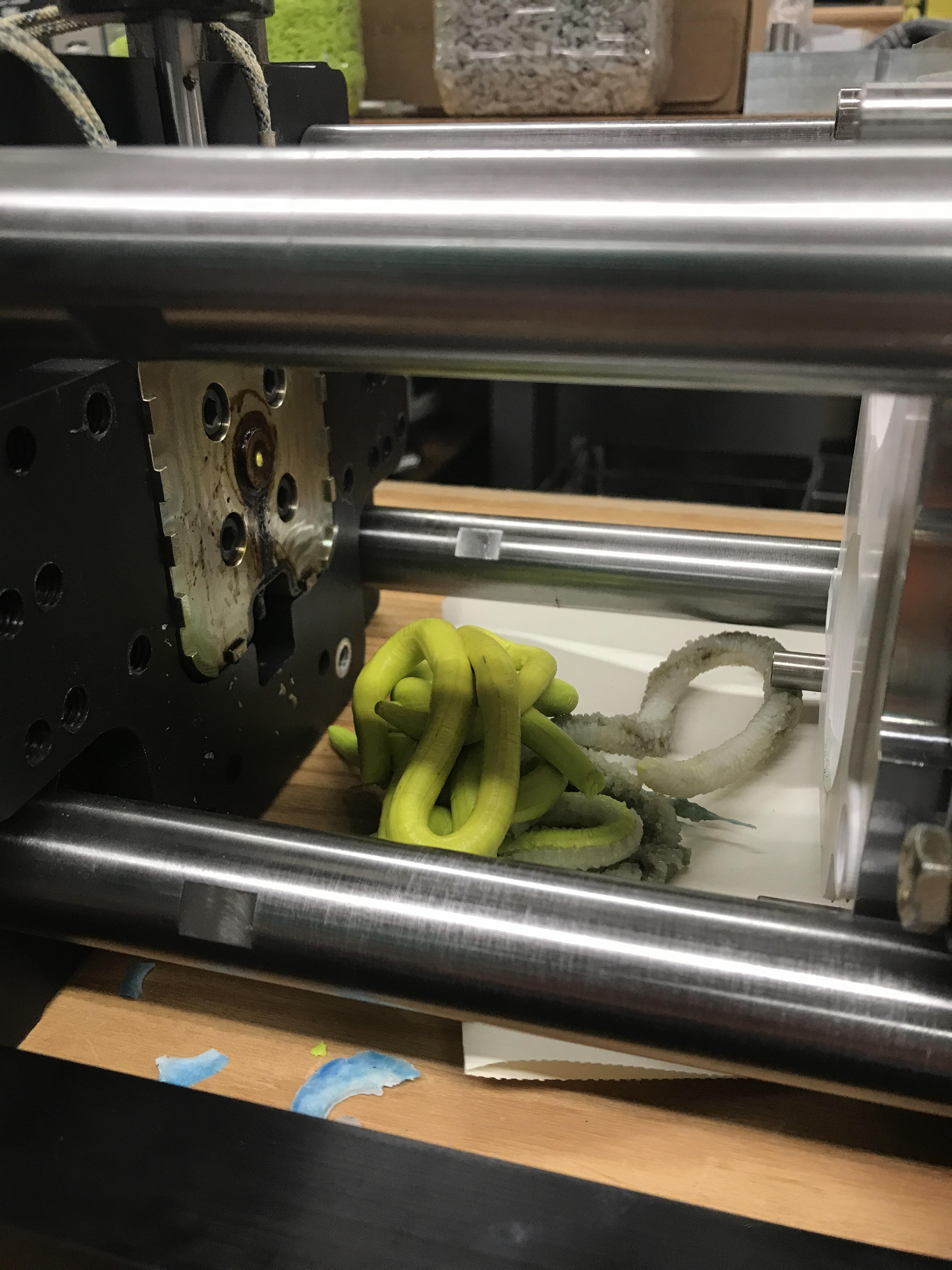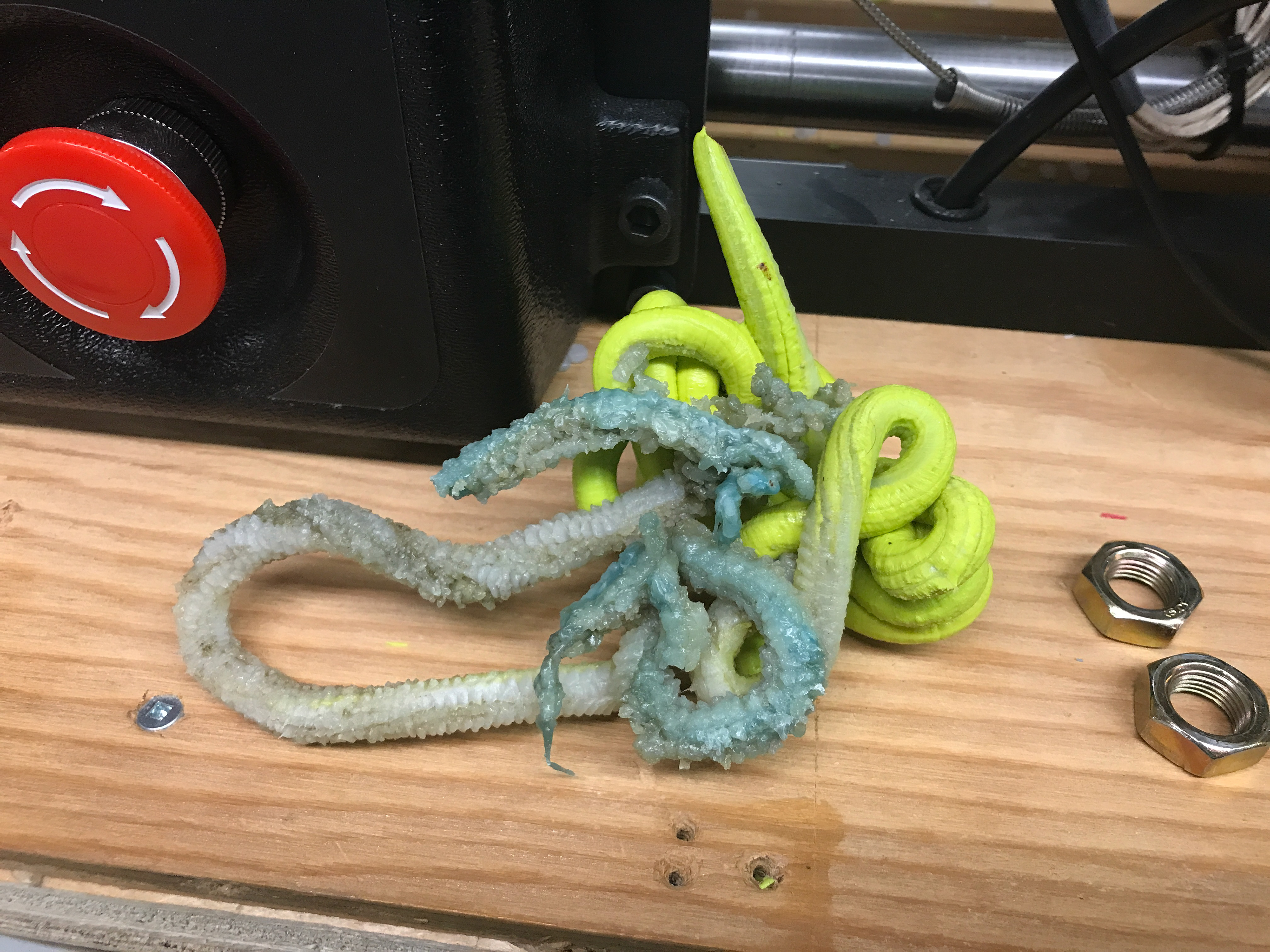 Nous avons commencé par essayer d'injecter avec des granules de HDPE recyclé. Cependant, la machine s'est rapidement bouchée et nous avons dû procéder à une nouvelle purge. Pour ce faire, nous avons abaissé la force d'extrusion et enlevé une moitié de moule. On peut voir que la chambre d'injection était encore bien remplie de vielle résine bleue qui s'est dégradée après avoir chauffé pendant trop longtemps. Nous avons aussi expulsé la résine verte qui était très élastique. Jaques Olivier est arrivé à ce moment et nous dit que c'est probablement mieux d'utiliser une autre résine puisque la verte, qui provient de gallons de détergent qui sont manufacturés en extrusion soufflage, pourrait nous donner du fils à retordre puisqu'elle se comporte différemment de la résine d'injection.