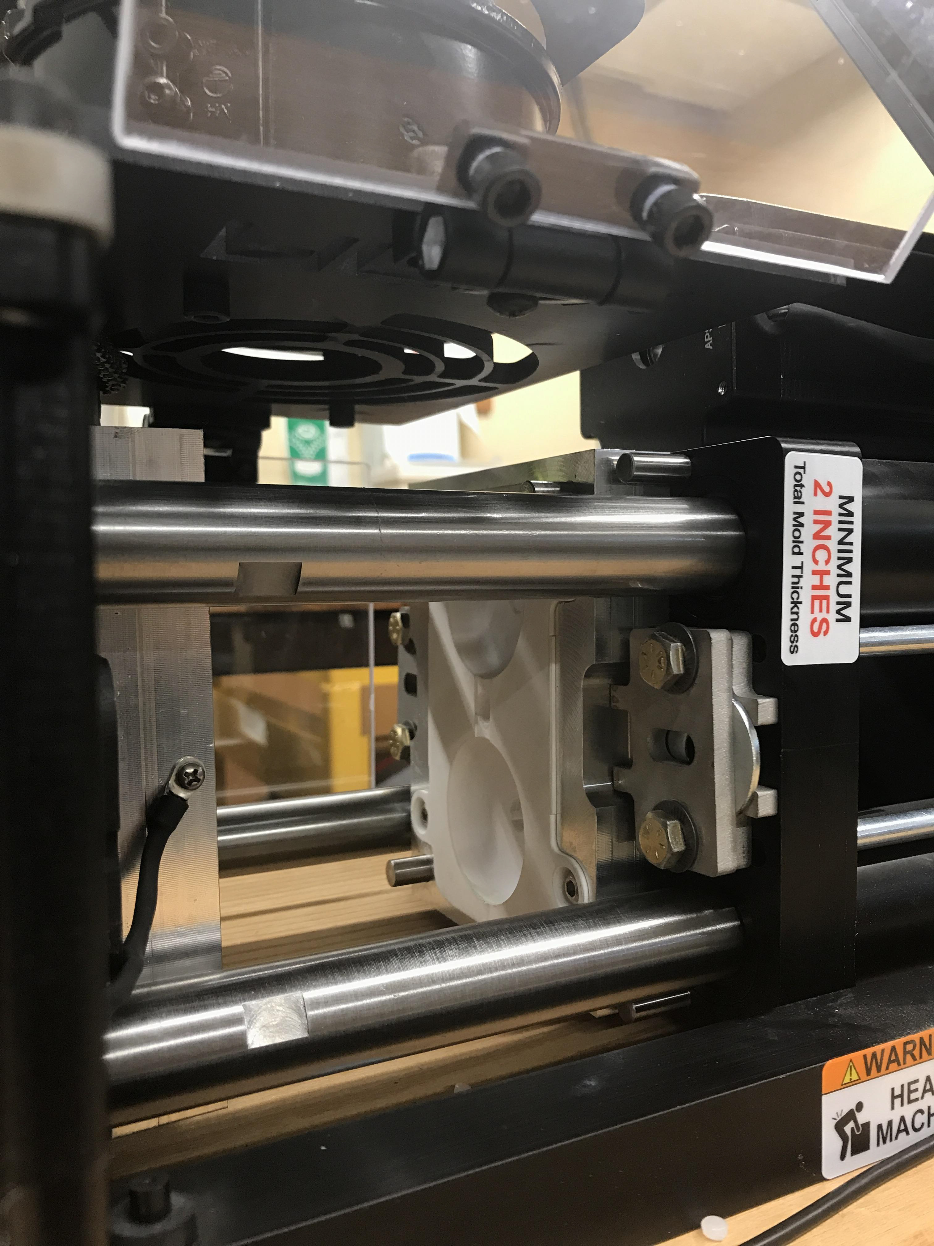 Aujourd'hui est enfin venu le grand jour de l'injection du yo-yo. Nous avons installé les nouvelles bases de moules sur la machine. Pour ce faire, on commence par installer la moitié du moule qui se trouve du côté de l'injection et on emboite l'autre mité en s'assurant que les quatre goupilles d'alignement soient insérées d'environ trois millimètres. Il est inutile de refermer le moule au complet.